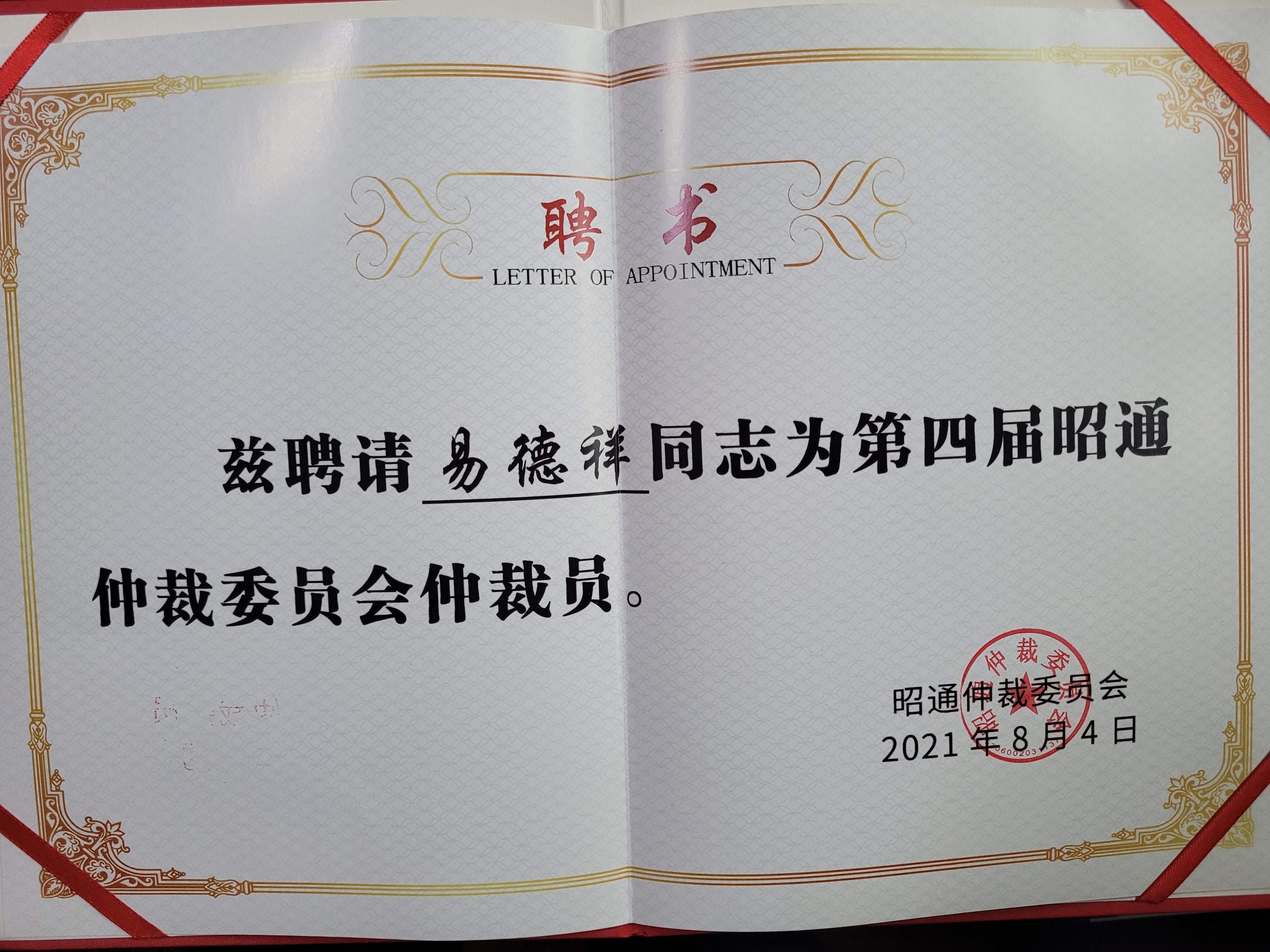 2021年8月4日,云南尚祥律师事务所易德祥主任被昭通昭通仲裁委选聘为第四届昭通仲裁委员会仲裁员,成为该仲裁委员会的50名仲裁员之一,是我所的荣耀,说明我所的律师执业道德和能力取得了社会的认可。