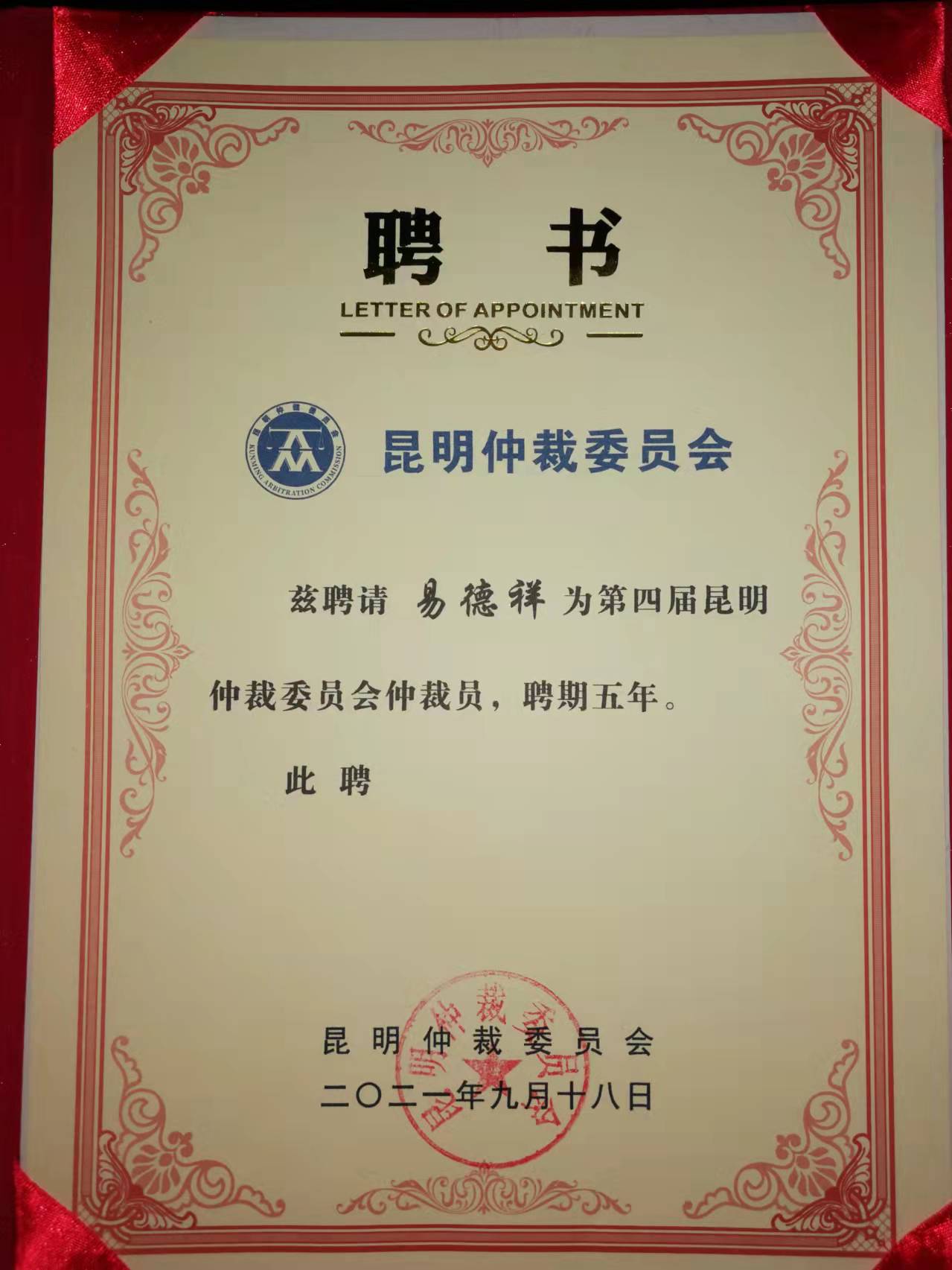 喜讯 云南尚祥律师事务所易德祥主任律师被聘任为昆明仲裁委员会仲裁员