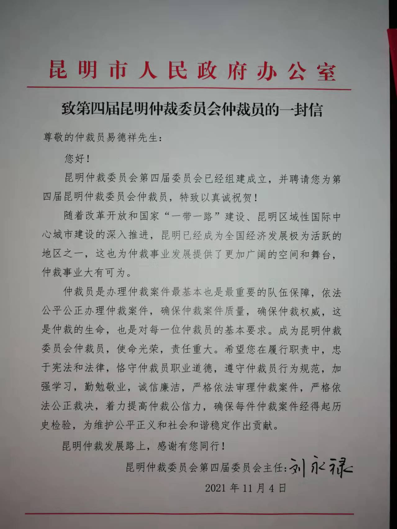 喜讯 云南尚祥律师事务所易德祥主任律师被聘任为昆明仲裁委员会仲裁员2022年1月15日,我所易德祥主任收到昆明仲裁委员会邮寄的担任第四届昆明仲裁委员会仲裁员的聘书、仲裁委主任所给仲裁员的信、昆明仲裁委员会仲裁规则、昆明仲裁委员会仲裁员名册,聘任易德祥担任第四届昆明仲裁委员会仲裁员,任期为五年。易德祥能担任昆明仲裁委员会仲裁员,说明我所的律师执业道德和能力取得了行业、社会的认可。据悉,第四届昆明仲裁委员会选聘276名仲裁员,系从身内外提出申请的人员中遴选。