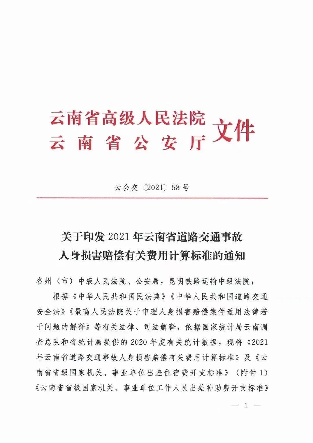 根据《中华人民共和国民法典》《中华人民共和国道路交通安全法》《最高人民法院关于审理人身损害赔偿案件适用法律若干问题的解释》等有关法律、司法解释,依据国家统计局云南调查总队和省统计局提供的2020年度有关统计数据,现将《2021年云南省道路交通事故人身损害赔偿有关费用计算标准》及《云南省省级国家机关、事业单位出差住宿费开支标准》(附件1)《云南省省级国家机关、事业单位工作人员出差补助费开支标准》(附件2)印发给你们,请贯彻执行。