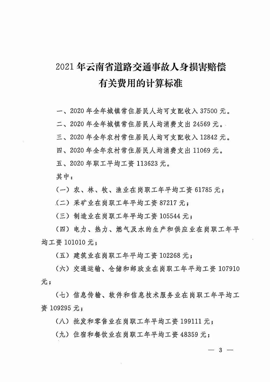 2021年云南省道路交通事故人身损害赔偿有关费用的计算标准