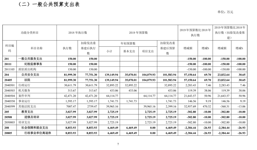 最高人民法院2019年一般公共预算支出152,797.62万元,比2018年执行数增加55,574.40万元、增长57.16%;2019年扣除发改委基建项目后预算为115,231.62万元,比2018年扣除发改委基建项目后执行数增加22,256.40万元、增长23.94%。按照党中央、国务院关于过紧日子的有关精神,2019年按不低于5%压减非刚性、非重要项目支出,同时重点保障了案件审判等支出,体现在有关支出科目中,具体安排情况如下: