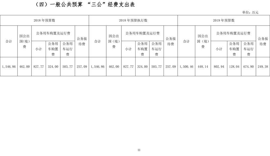 为贯彻落实中央八项规定精神,坚持勤俭节约,反对铺张浪费,最高人民法院积极采取有效措施,切实提高“三公”经费预算约束力,严格控制2019年“三公”经费预算规模。2019年财政拨款安排“三公”经费预算1,500.46万元,其中:因公出国(境)费448.14万元, 公务用车购置费128.04万元,公务用车运行费674.90万元,公务接待费249.38万元。2019年“三公”经费预算比2018年减少46.40万元,下降3%,主要原因是:按照党中央、国务院关于过“紧日子”和坚持厉行节约反对浪费的要求,进一步压减因公出国(境)费、公务用车购置及运行费和公务接待费支出。