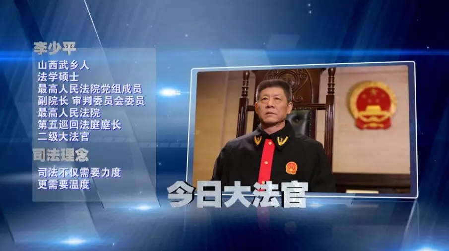 2019年12月4日和5日,播出《大法官开庭》之《重生》(上下集)。这两期节目中审案的大法官是最高人民法院党组成员、副院长、审判委员会委员,最高人民法院第五巡回法庭庭长,二级大法官李少平。