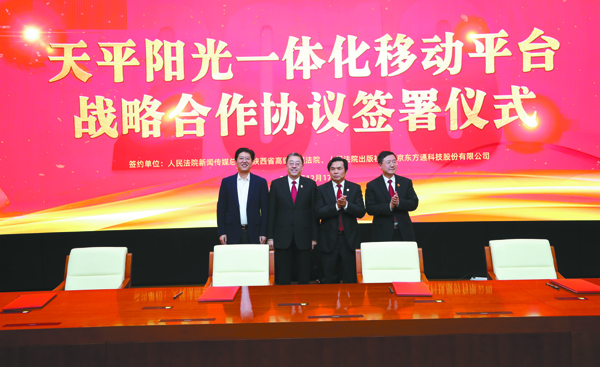 图为人民法院新闻传媒总社党委书记、社长倪寿明与有关合作方签署天平阳光一体化移动平台战略合作协议。程国维 摄