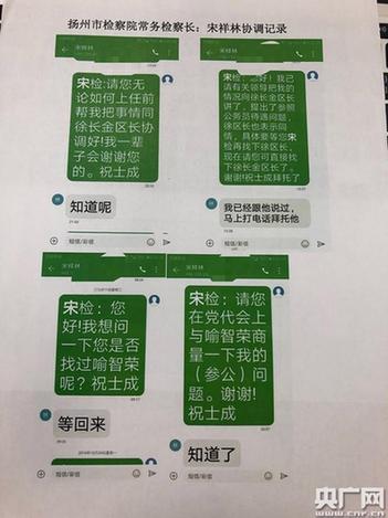 根据《扬州日报》的报道,祝士成所指的区领导,因贪污受贿已于2017年被判刑。根据扬州市纪委的通报,“这名领导干部严重违反工作纪律,接受他人请托,向有关部门打招呼、说情,干预和插手司法活动。”