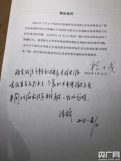 至于前任区长陈曦,记者多次联系他,均未能得到回复。不过一份疑似其手写的书面证明显示,宋祥林副检察长曾多次电话并当面联系他,协调祝士成退休待遇问题。祝士成称,这份证明写于2018年3月12日,是他找到已调任新岗位的陈曦反映无法按当年承诺的待遇退休。
