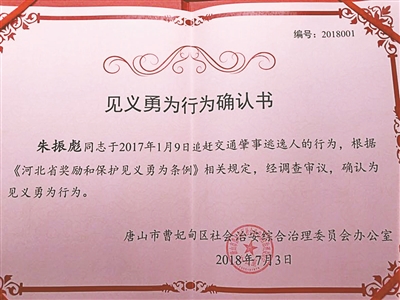 当天上午,朱振彪刚刚从唐山市曹妃甸区综治办领到了《见义勇为行为确认书》。红色的证书里,除了时间落款外,对朱振彪内容的描述只有两行半:“朱振彪同志于2017年1月9日追赶交通肇事逃逸人的行为,根据《河北省奖励和保护见义勇为条例》相关规定,经调查审议,确认为见义勇为行为。”