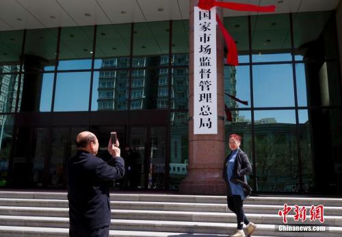 资料图:4月10日,新组建的国家市场监督管理总局在北京正式挂牌。图为民众与新牌合影。 中新社记者 贾天勇 摄