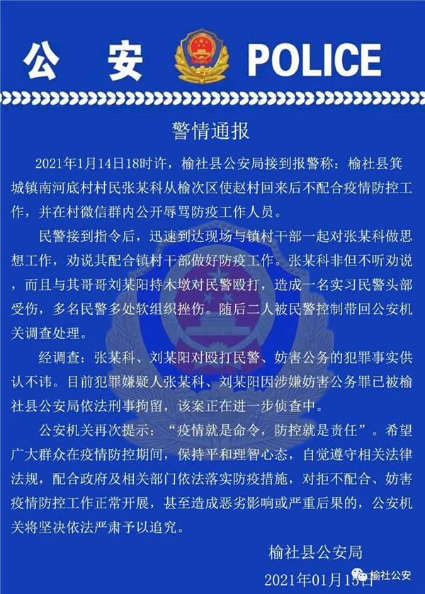 拒不配合疫情防控工作,还在村微信群里公开辱骂防控人员,殴打劝说民警。山西省晋中市榆社县公安局通报,张某科、刘某阳因涉嫌妨害公务罪,已被刑事拘留。